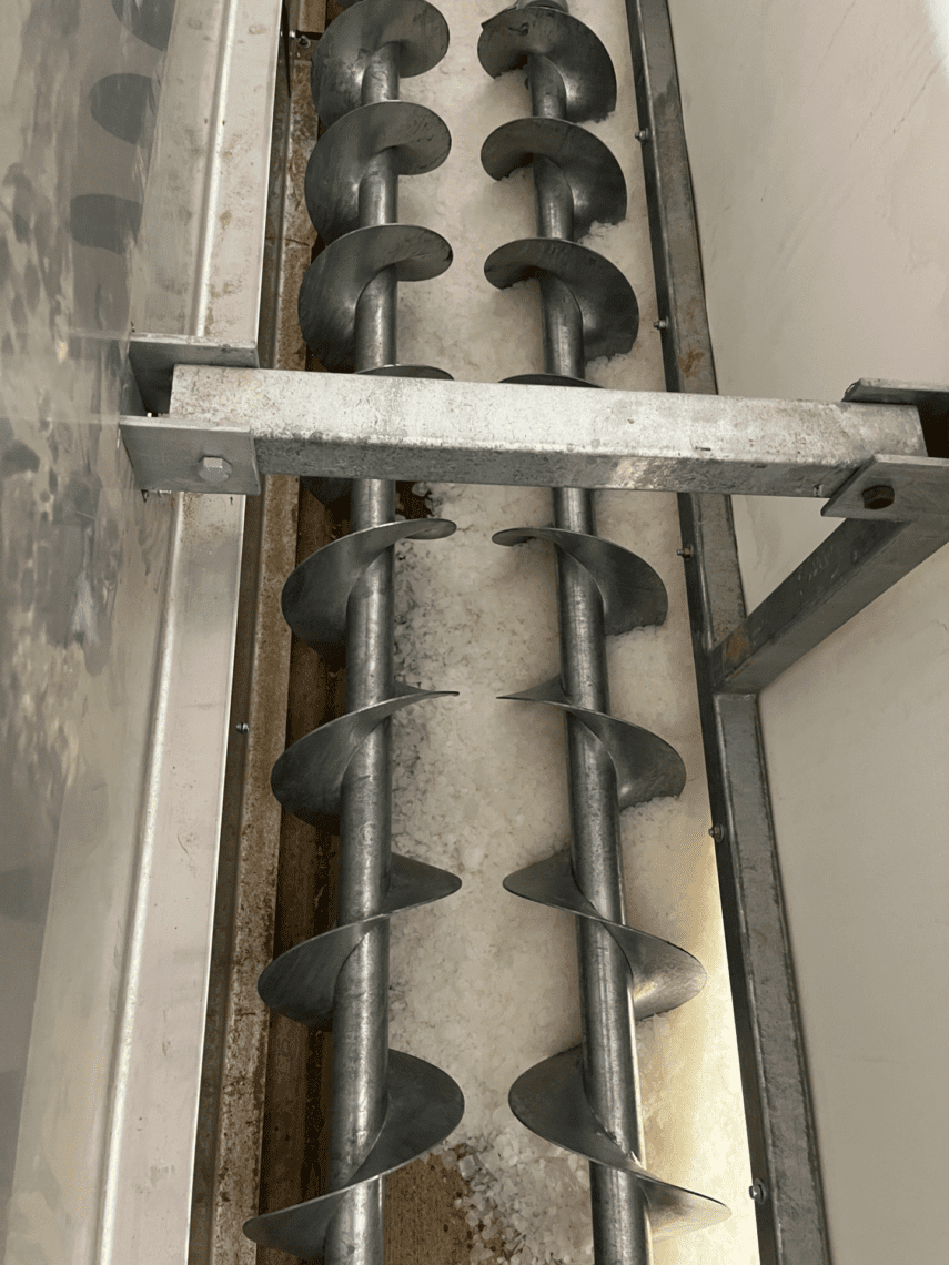 A pump pulls water from the reservoir, and the refrigeration system freezes it before it reaches a conveyor. The conveyor brings the ice to the concrete, spreading it evenly to lower the concrete’s temperature. The current refrigeration system could not meet the project’s demand for ice. Therefore, the project owner selected Zero Zone to integrate another system to increase ice production.
